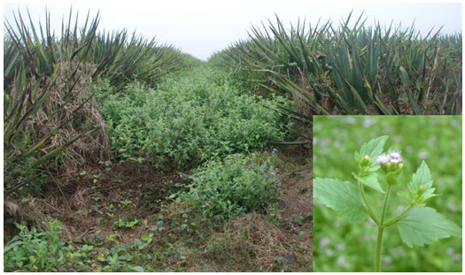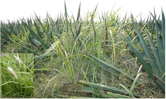 剑麻园杂草种类繁多,竞争水肥光,传播病虫害,影响剑麻的生长和产量。据调查,剑麻园杂草有130多种,其中危害严重的有阔叶类杂草:假臭草Praxelis clematidea、飞机草Chromolaena odoratum、鬼针草Bidens pilosa、银胶菊parthenium hysterophorus等;禾本科杂草:白茅Imperata cylindrica var. major、红毛草Melinis repens、马唐属Digitaria spp.、牛筋草Eleusine indica、大黍Panicum maximum等;莎草科杂草:香附子Cyperus rotundus。